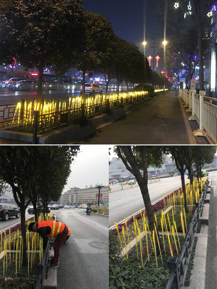 西安蓮湖區(qū)2019年元旦、春節(jié)亮化工程。項目包括鐘鼓樓燈光花籃雕塑,郵政廣場亮化、北大街主干道的亮化。采用了麥穗插地?zé)?、郁金香插地?zé)?、芙蓉花插地?zé)?、小品燈球、串燈等多款造型燈具,共同打造出北大街沿線的夜景風(fēng)光。