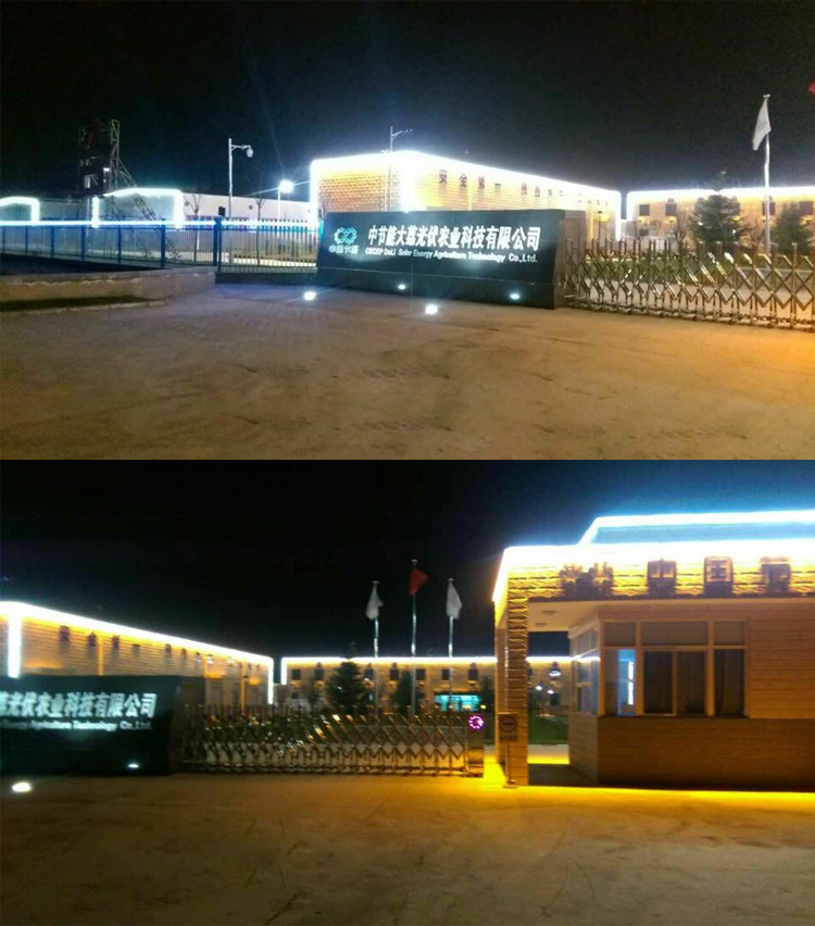 中節能大荔光伏農業科技有限公司廠區亮化項目,是我們陜西蘭光照明2015年承接的亮化工程。公司設計師根據廠家要求簡單實用的特點,整個廠區的設計全部采用線條燈和輪廓燈,將整個廠區的廠房、大門、廠區道路、辦公樓以輪廓勾勒的形式展現出來,照亮整個廠區,達到客戶廠區樓宇亮化需求。