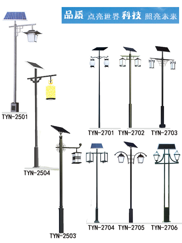 簡介—— 太陽能庭院燈根據用途的區別,可以有單板單頭、單板雙頭、雙板雙頭的類型,造型相對于市電路燈來說。外觀的樣式更加的豐富,可以感覺安裝地區的特點,選擇適合的外觀造型。